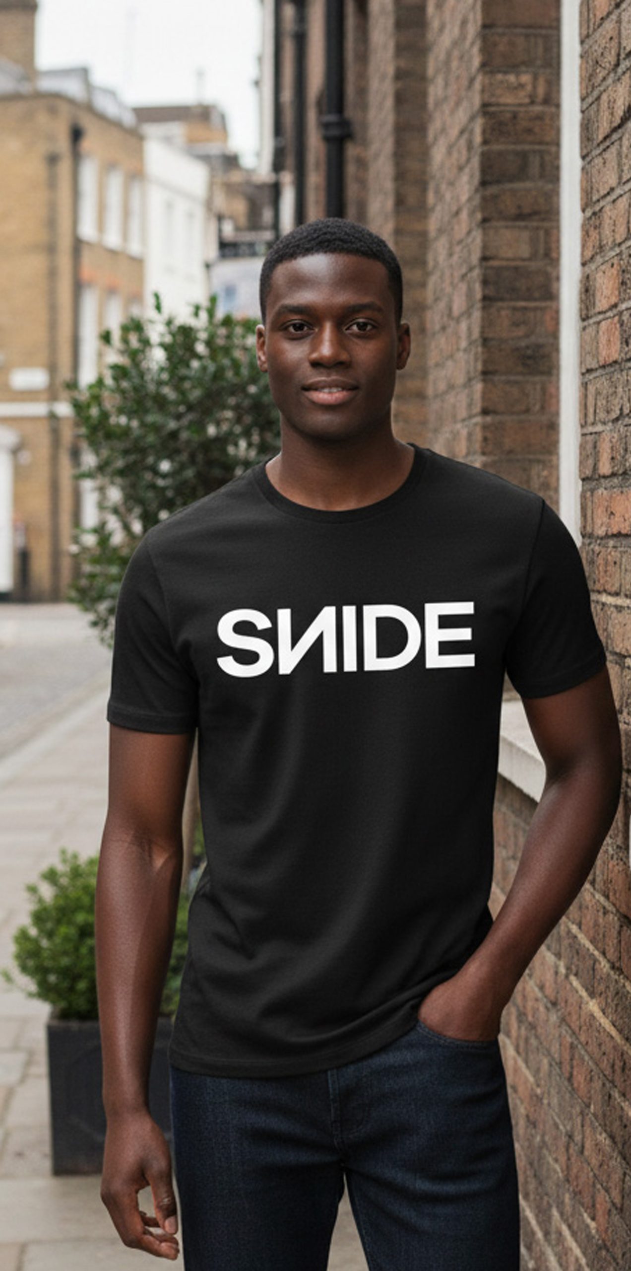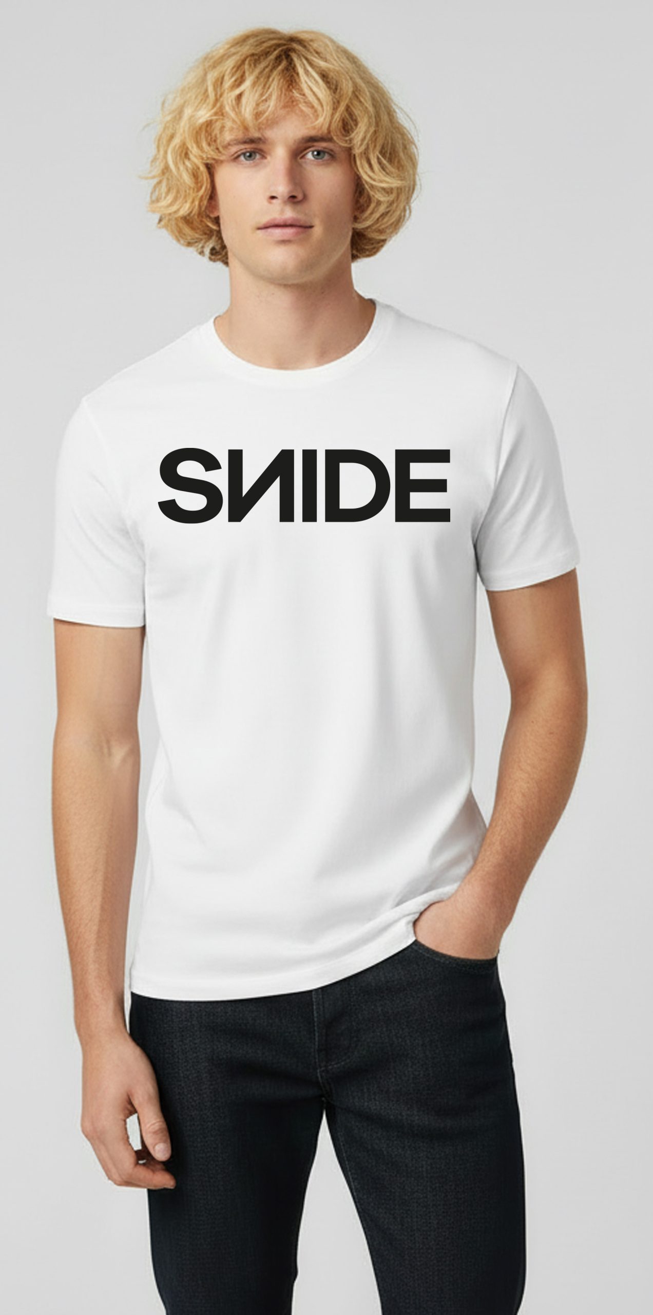 Our classic Snide design comes in blue, white, or black tees, or the iconic 98% original in black with red and white print. Also check out the cool shorts and even our limited edition bag.
