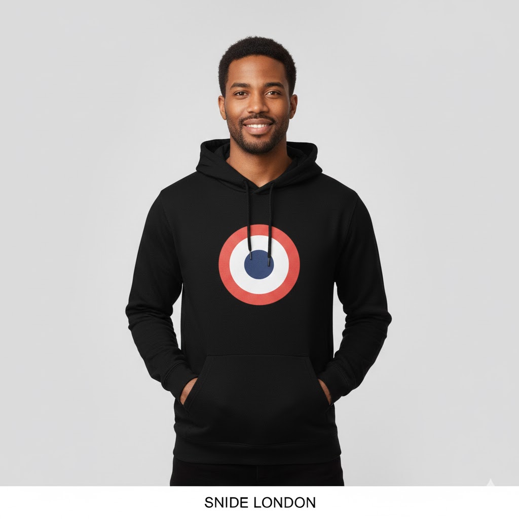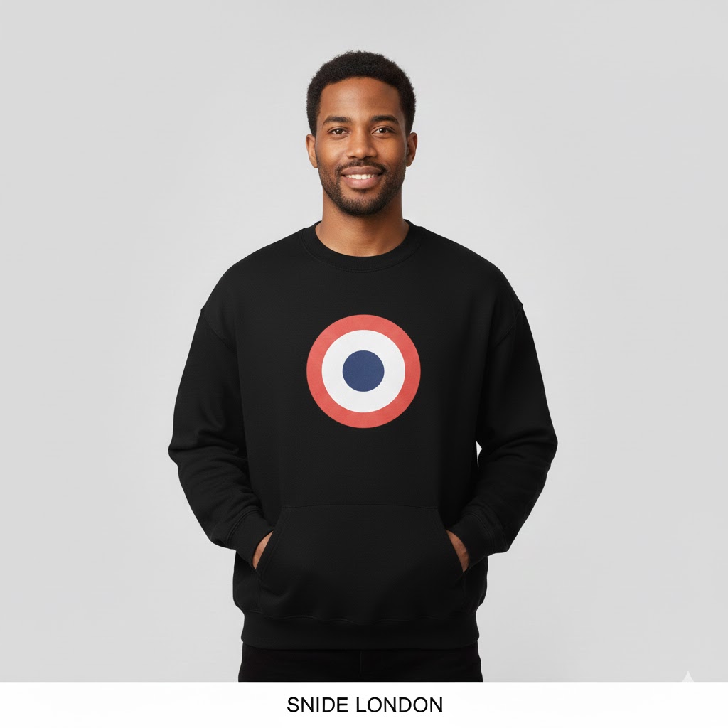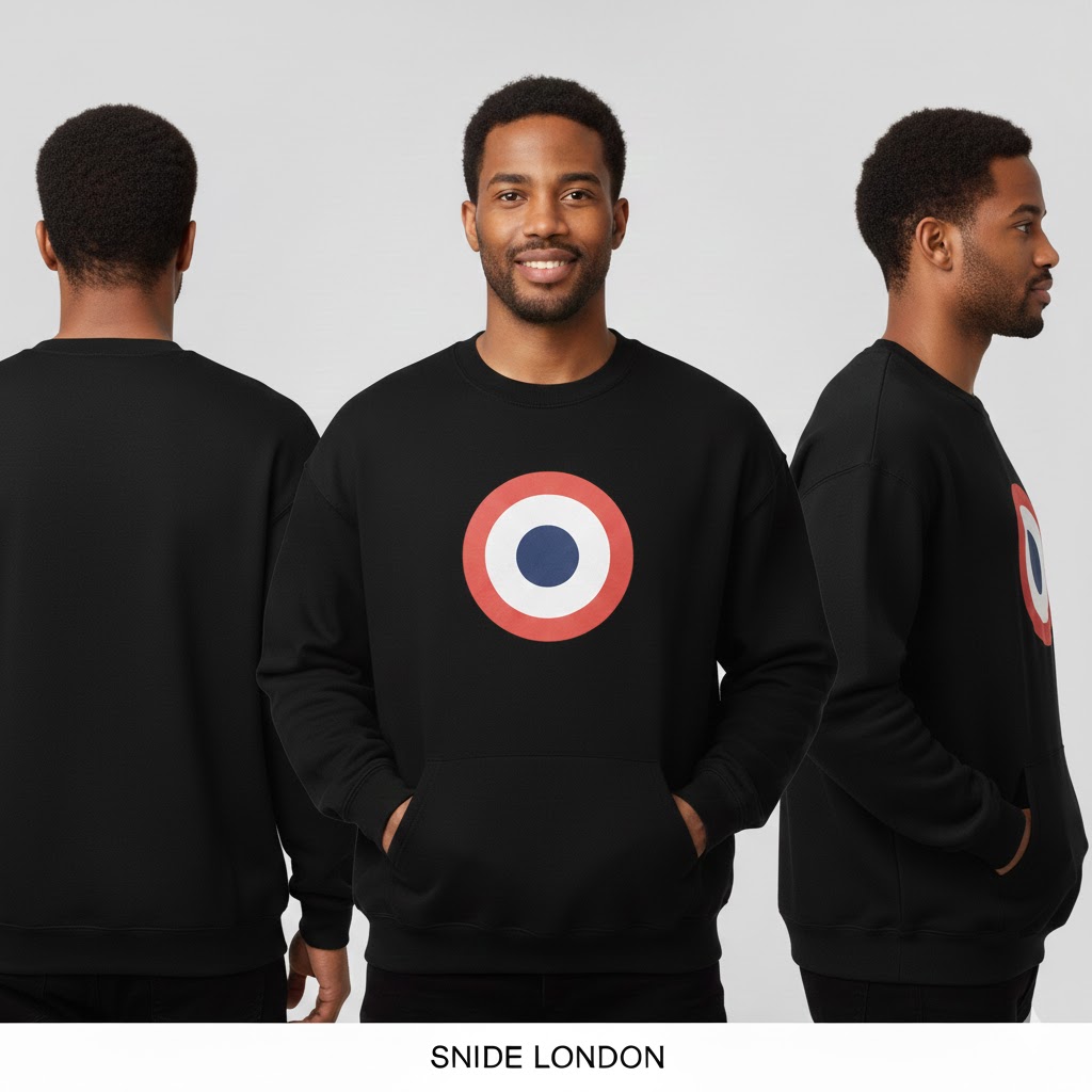 The inverted insignia design appears on a black sweat, a black hoodie, or on a choice of black or white tees.